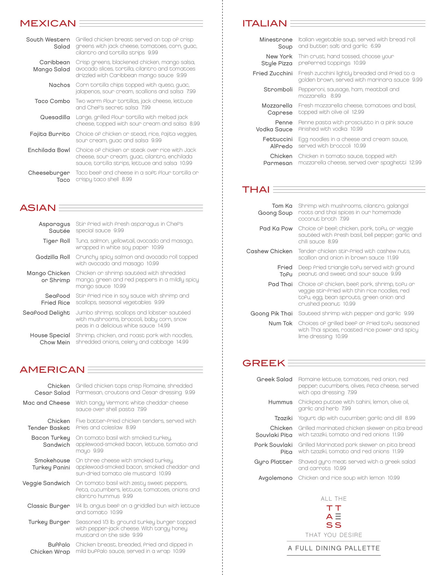 The typographic display on the menu design demonstrates understanding of type hierarchy, layout, spacing, legibility and effective use of color. There is a great amount of text but the menu is successful in its design and navigation.
